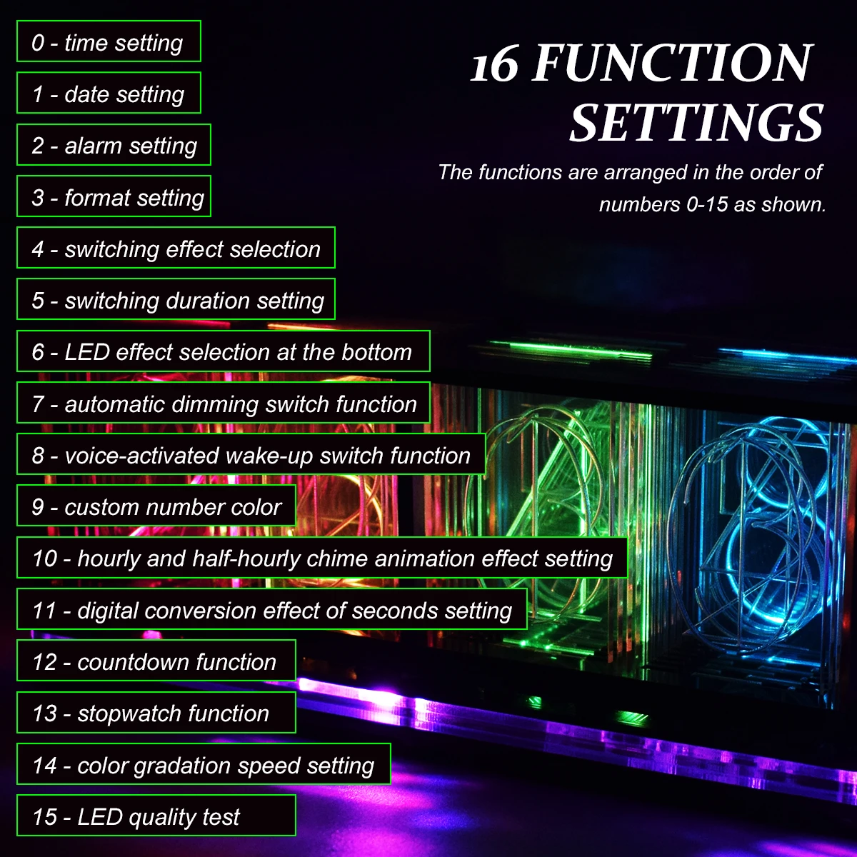 [16 Function Settings] Time setting, date setting, alarm setting, format setting, switching effect selection, switching duration setting, LED effect selection at the bottom, automatic dimming switch function, voice-activated wake-up switch function, custom number color, hourly and half-hourly chime animation effect setting, digital conversion effect of seconds setting, countdown function, stopwatch function, color gradation speed setting, LED quality test. (The functions are arranged in the order of numbers 0-15 as shown.)