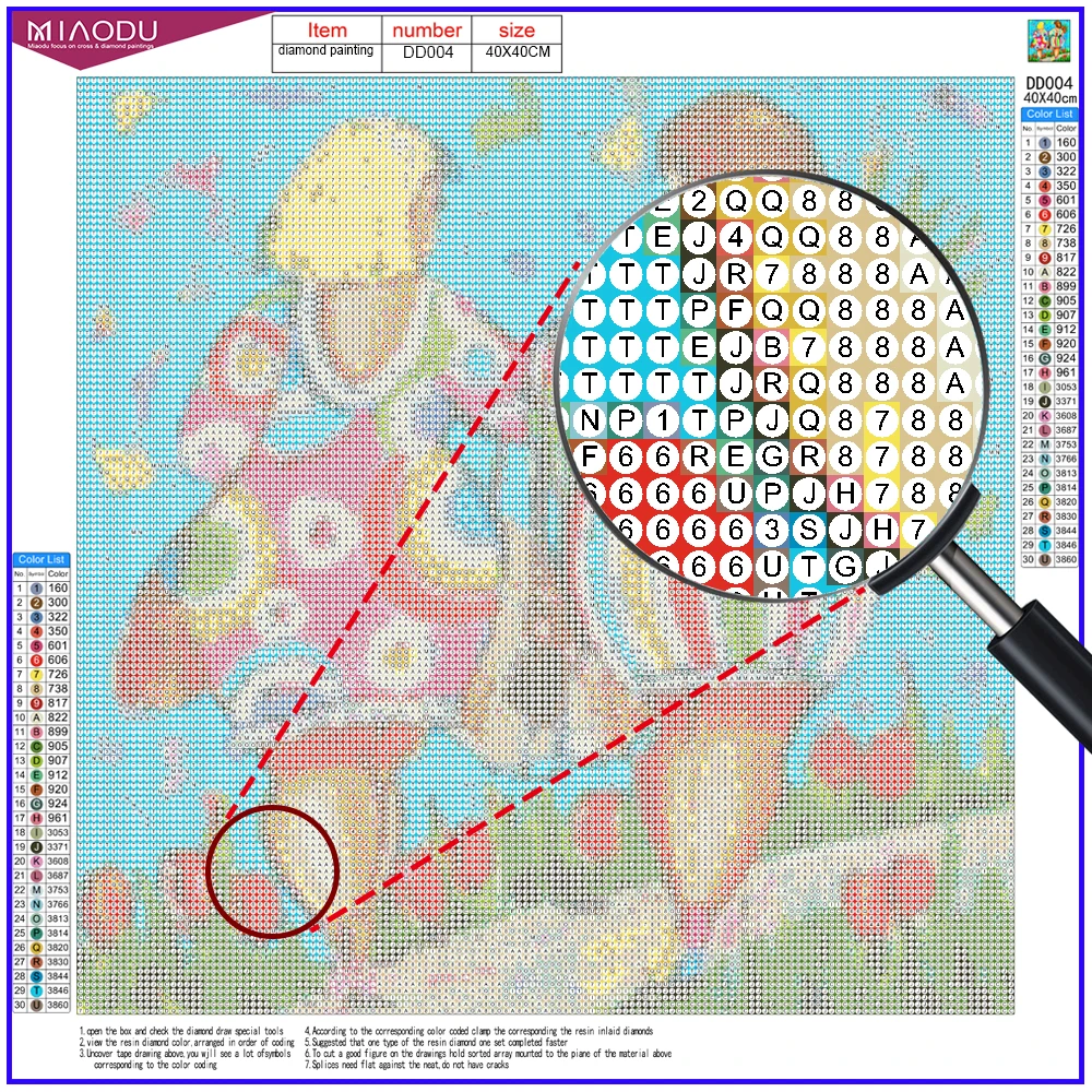 1. Refer to the comparison table on the canvas to identify each diamond number and the corresponding printed number on the canvas.2. Insert the round end of the dotting pen into the dotting cement (push hard to keep the cement in place).