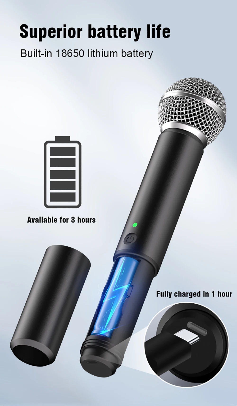- Microphone Battery: 18650 3.7V Lithium Battery